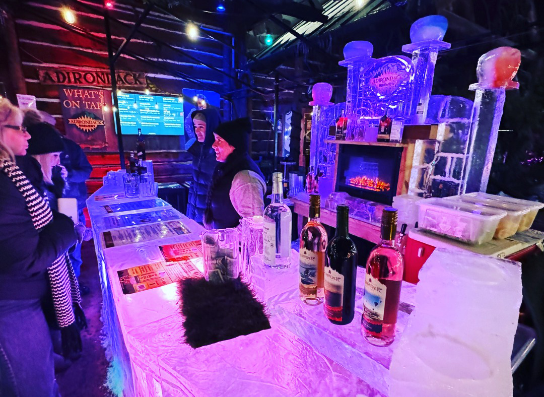 Sip handcrafted cocktails and mocktails made with local spirits, along with Adirondack Brewery beer, cider, and non-alcoholic options—all served from a sculpted ice bar.Disco-Inspired Ice Sculptures